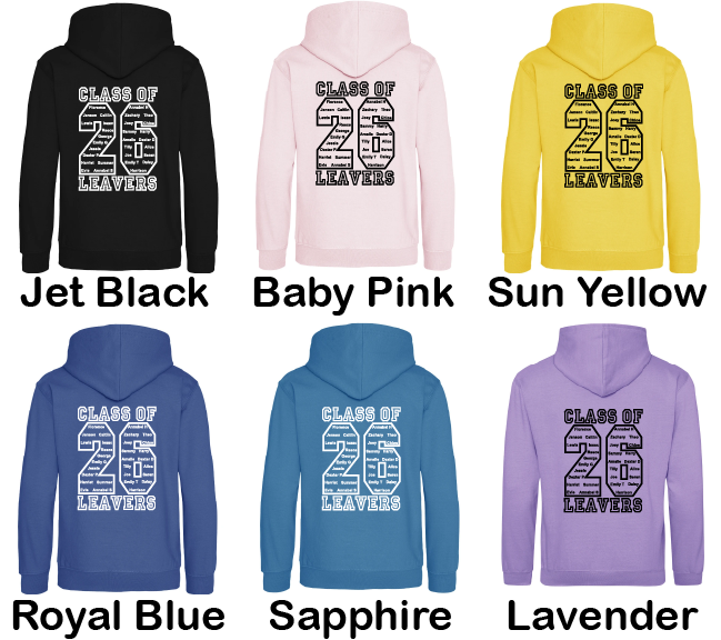 Barwick Leavers Hoods 2026 embroidered with the school logo to the left breast and printed with the class names within the 26 on the back of the hood