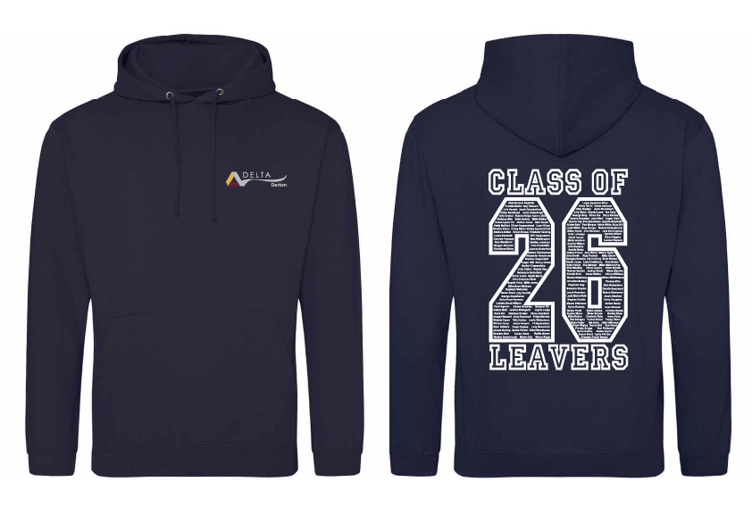 Darton Academy Year 11 Leavers Hoodie embroidered with the Academy logo with students name within the ’26’ on the back with optional initials on the right breast