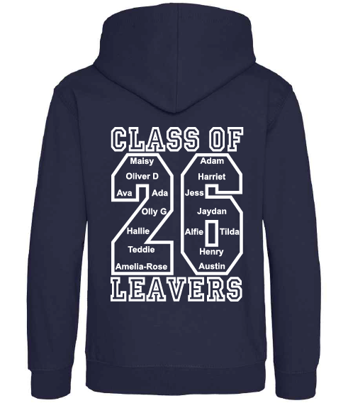 Kippax Greenfield Primary School Year 6 Leavers Hoodie embroidered with the Kippax Greenfield logo with names within the ’26’ printed on the back