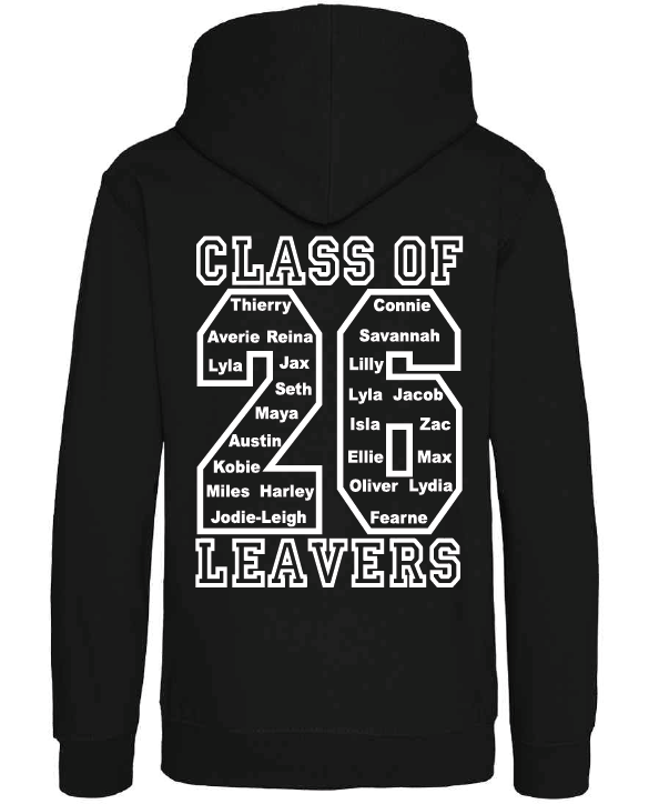 Swillington Primary School Year 6 Leavers Hoodie embroidered with the Swillington logo with names within the ’26’ printed on the back